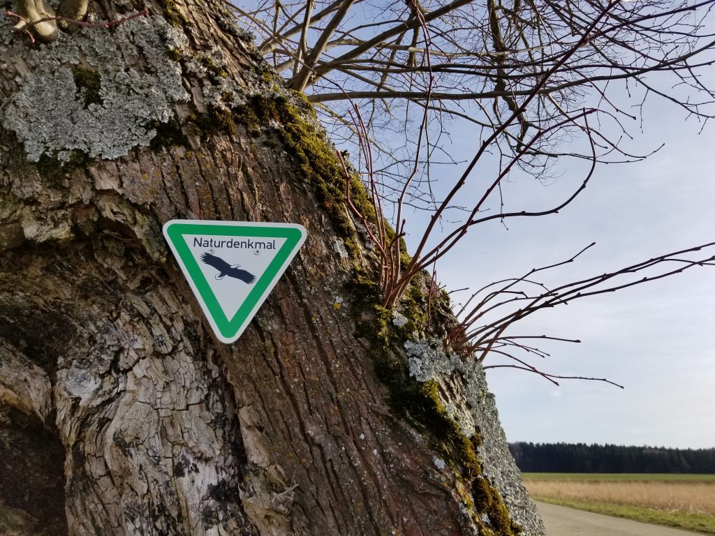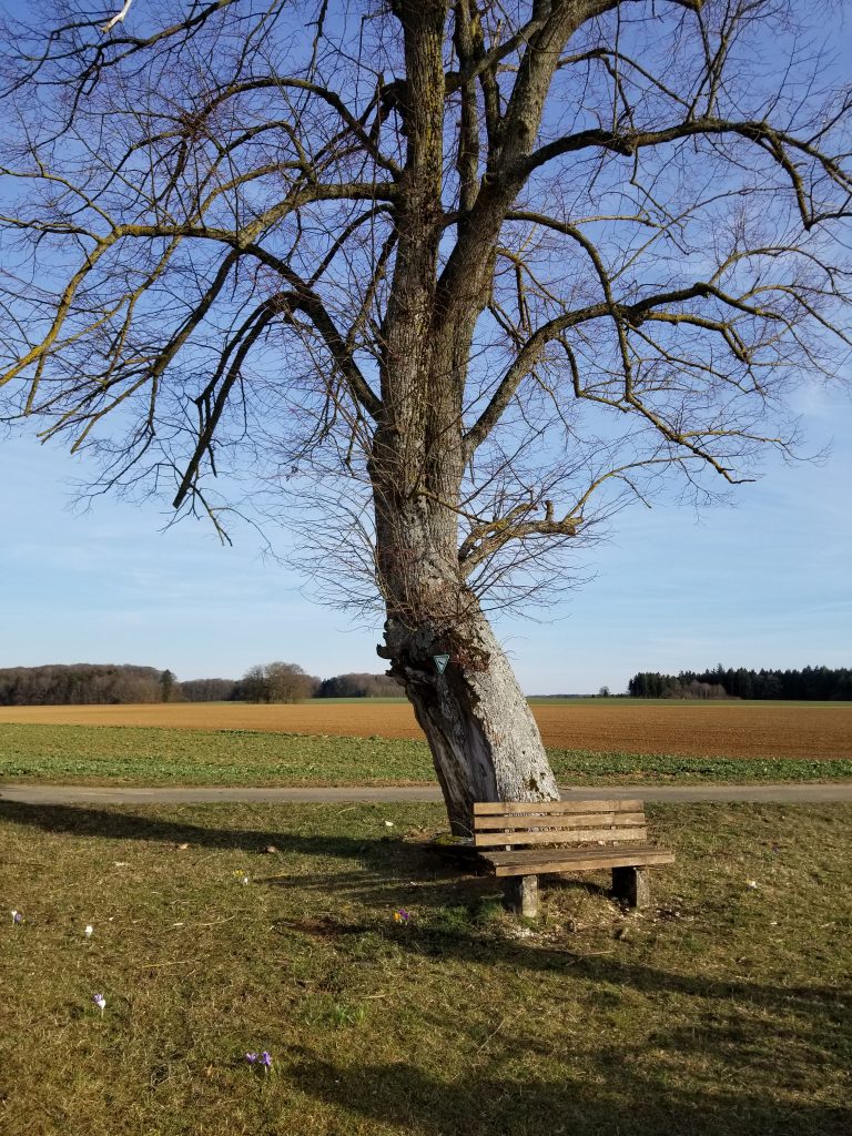 Freistehender Baum mit Ruhebank. Lädt ein für eine kurze Pause zum Innehalten. Momentan zeige ich Sie im Frühling.
