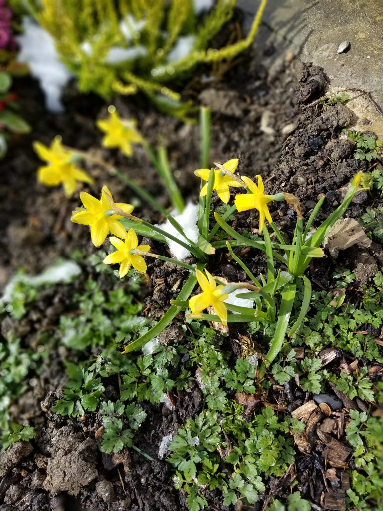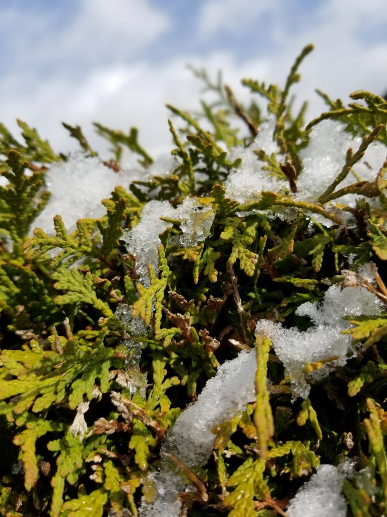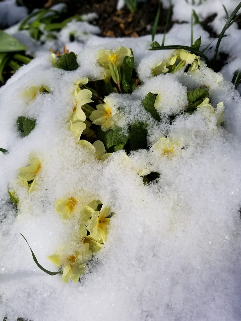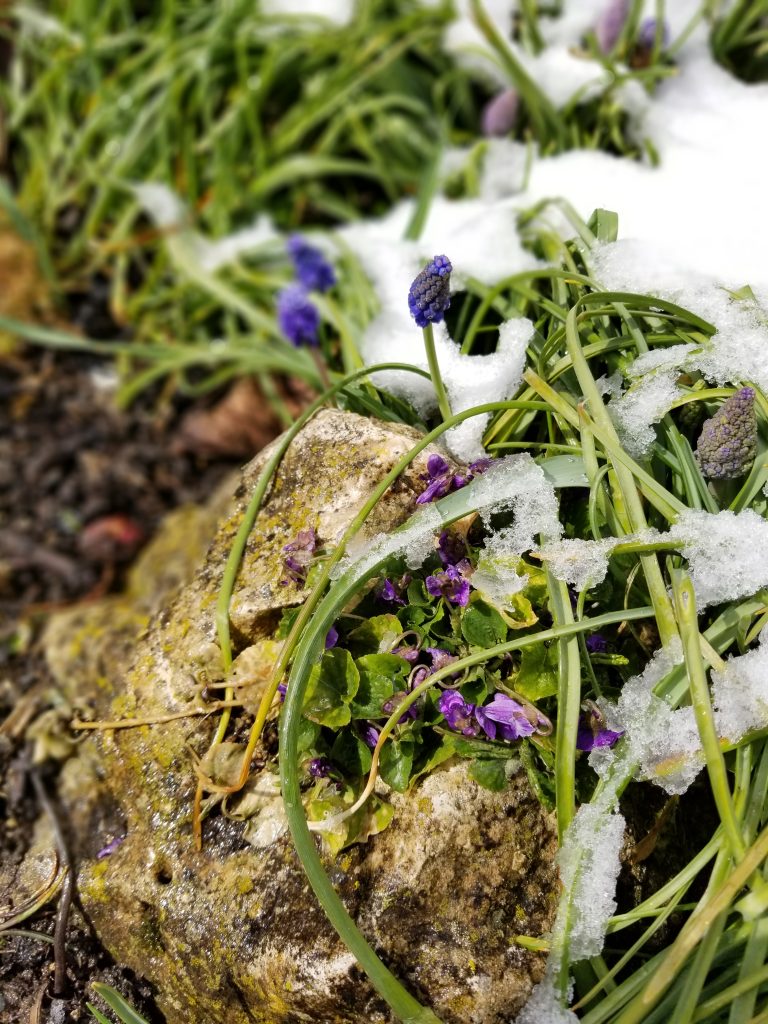 Blüten sind schon da – aber es ist Schnee gefallen. So gesehen in Berghülen.