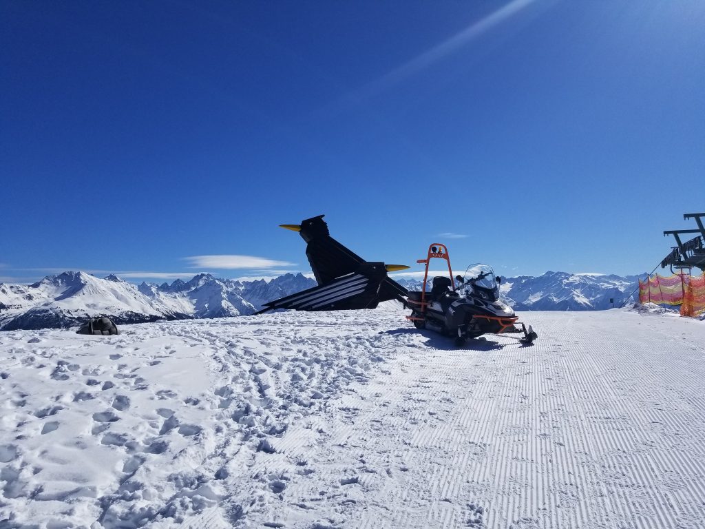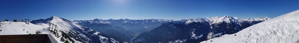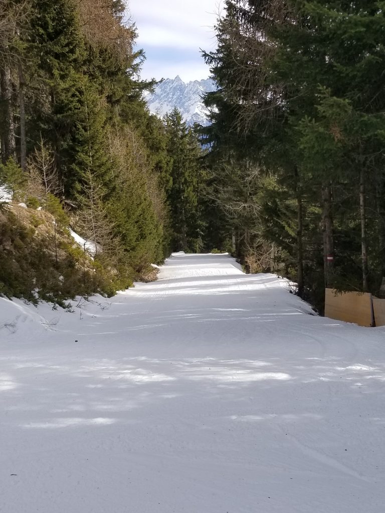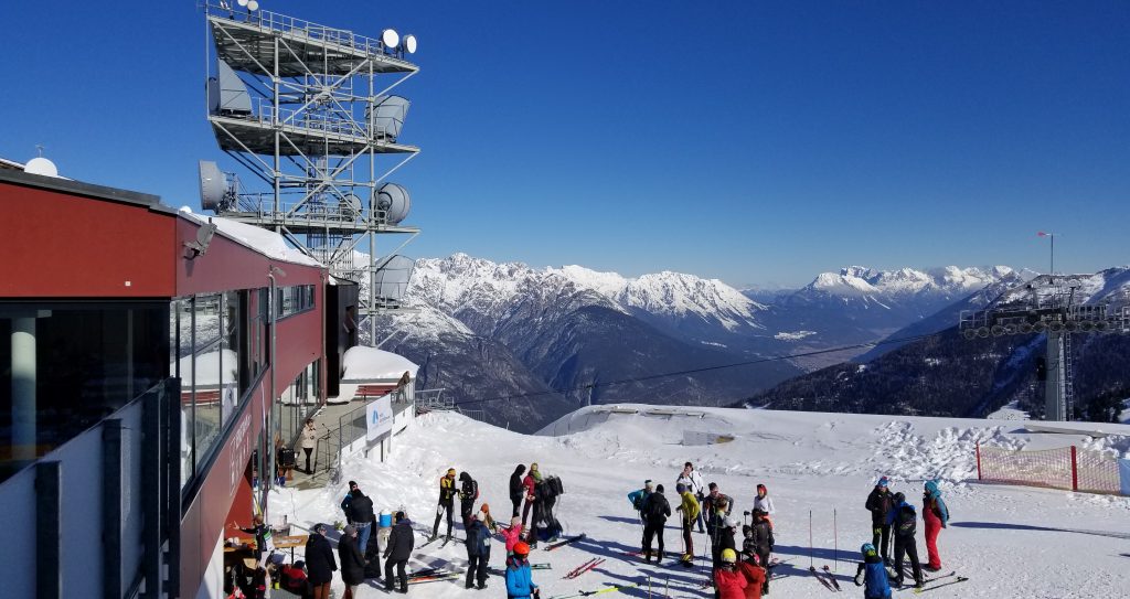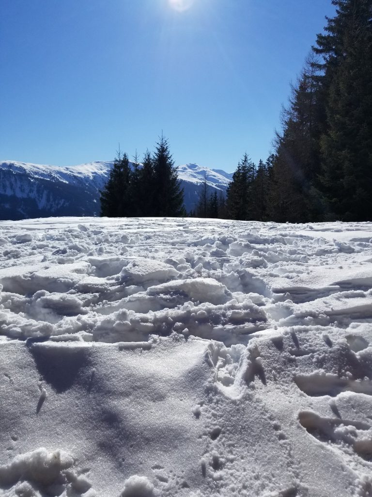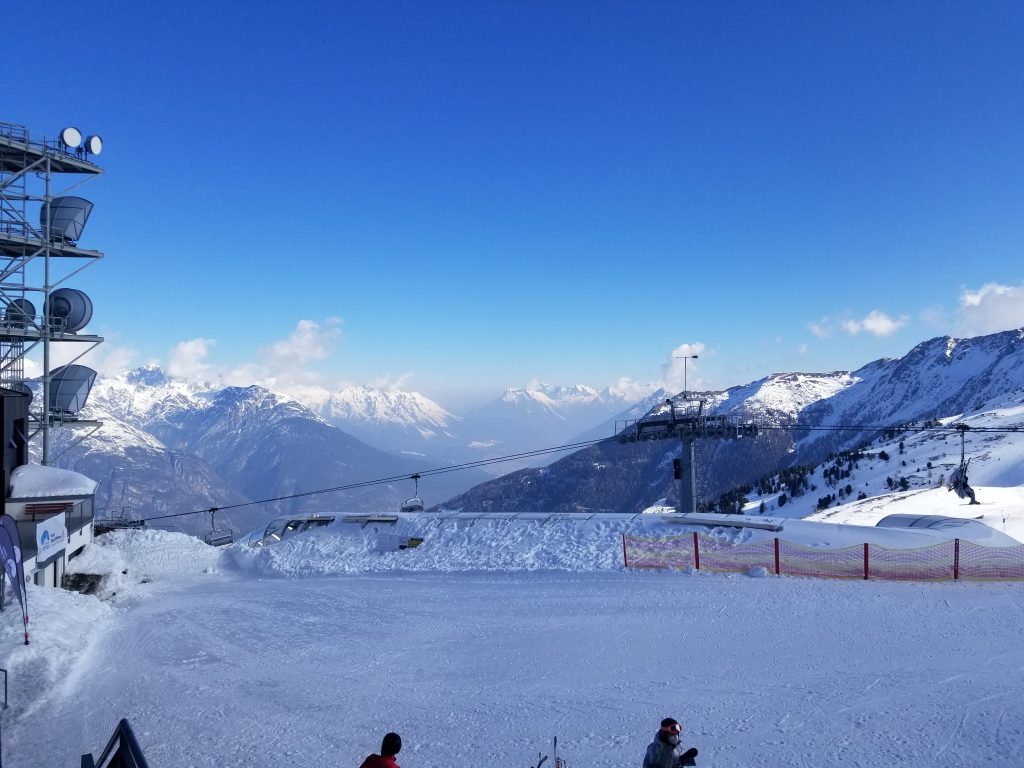 Bei herrlichem Wetter in den Bergen. Es liegt Schnee und die Pistenbedingungen sind sehr gut.