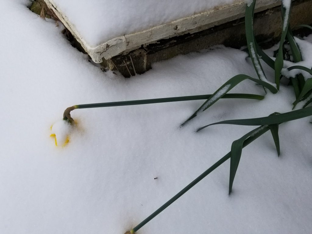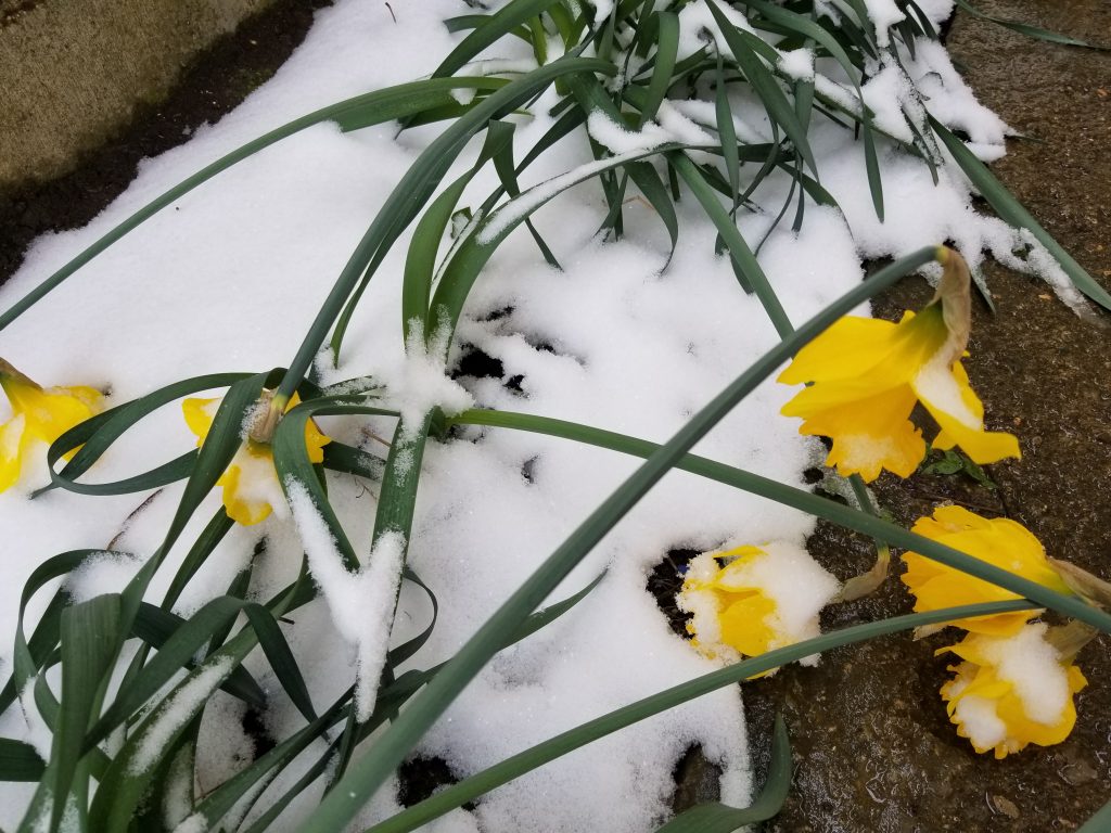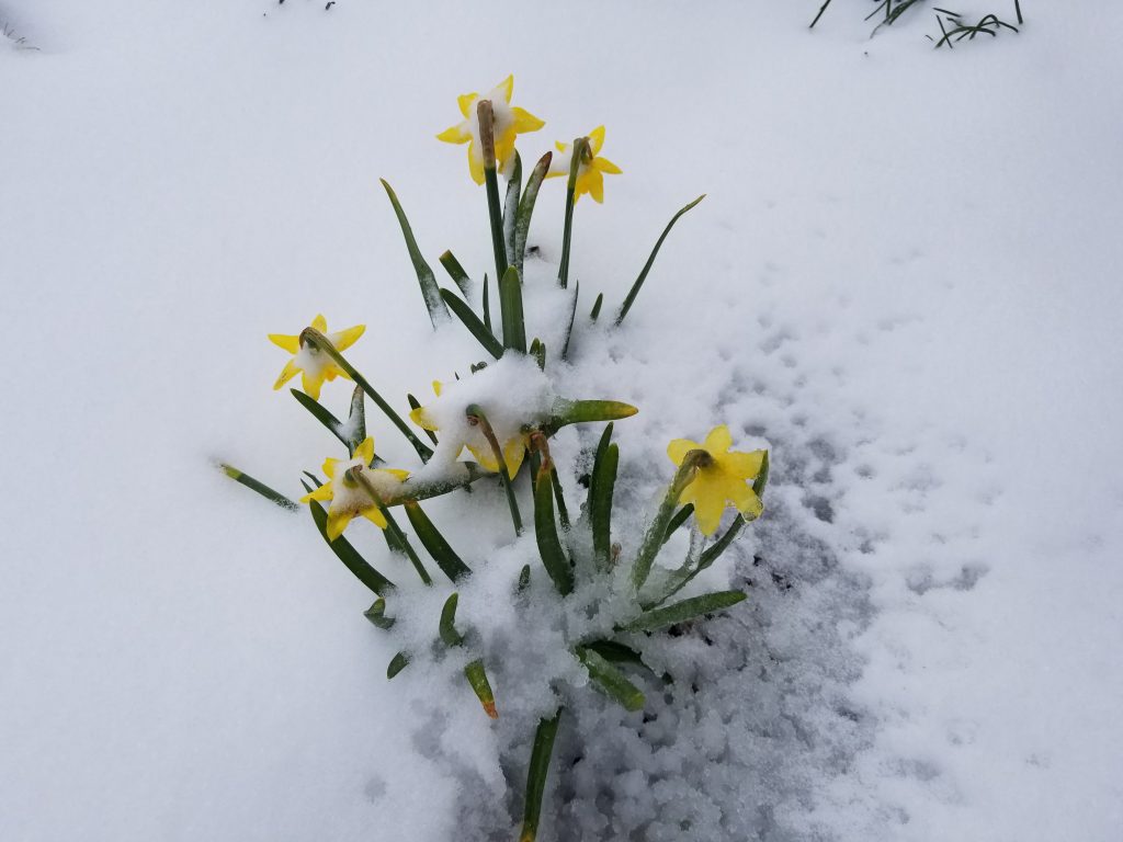 Der Schnee trifft auch die schon blühende Blumen hart. Wir sind gespannt, wann der Frühling kommt.